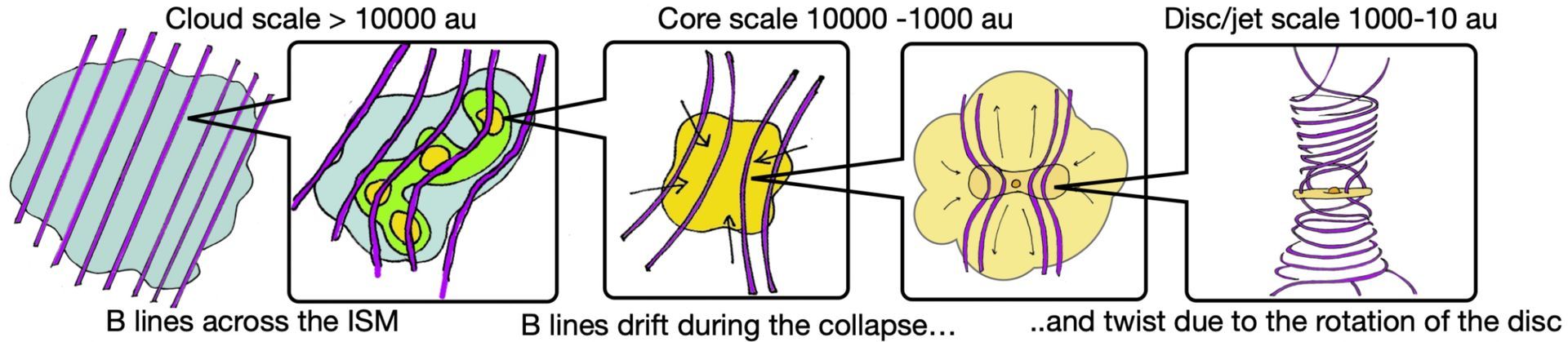 Jaunas zvaigznes veidošanās un magnētiskā lauka līniju (purpura krāsā) shēma dažādos telpiskos mērogos, atbilstoši magnētiski regulētā kolapsa modelim.