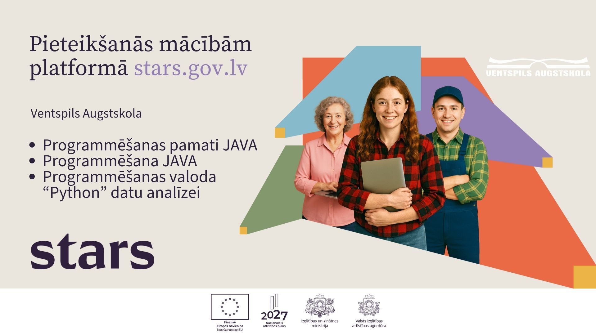 Ventspils Augstskolas Mūžizglītības centrs platformā stars.gov.lv aicina apgūt studiju kursus “Programmēšanas pamati JAVA”, “Programmēšana JAVA” un “Programmēšanas valoda “Python” datu analīzei. Mācības notiek ar ES līdzfinansējumu. Projektā “Individuālo mācību kontu pieejas attīstība”, kurā dalībniekiem tiek piešķirti 500 EUR kursu apguvei, VeA Mūžizglītības centrs piedāvā studiju kursu “Programmēšanas valoda “Python” datu analīzei” . Mācību maksa ir 386,25 eiro, ko iespējams pilnībā segt no projektā piešķirtajiem līdzekļiem. Kurss sniedz zināšanas par programmēšanas valodu “Python”, kas ir viena no populārākajām un vieglāk apgūstamajām programmēšanas valodām. Tā tiek plaši izmantota uzņēmējdarbībā, pētniecībā un valsts pārvaldē datu apstrādei un analīzei. Mācību laikā dalībnieki apgūs datu apkopošanu, strukturēšanu, analīzi un pārskatu sagatavošanu, lai pieņemtu pamatotus lēmumus. Mācību norises laiks: 02.02.2026.–03.04.2026. Kopējais apjoms: 32 akadēmiskās stundas tiešsaistē + 43 stundas patstāvīgais darbs Mācību formāts: attālināti, darba dienu vakaros no 18.00 Pieteikšanās: https://stars.gov.lv/programma/22 Projektā “Atbalsts pieaugušo individuālajās vajadzībās balstītai pieaugušo izglītībai”, kurā tiek segti 70 % no mācību maksas, tiek piedāvāti šādi kursi: Programmēšanas pamati JAVA Kurss paredzēts interesentiem bez priekšzināšanām vai ar nelielu pieredzi programmēšanā. Mācību laikā tiks apgūti JAVA programmēšanas pamati, algoritmiskā domāšana un praktiskās iemaņas vienkāršu programmu izstrādē. Mācību norises laiks: 02.02.2026.–18.05.2026. Kopējais apjoms: 64 akadēmiskās stundas tiešsaistē + 88 stundas patstāvīgais darbs Mācību maksa ar 30 % līdzmaksājumu*: 123,64 € Mācību formāts: attālināti, darba dienu vakaros no 18.00 Pieteikšanās: https://stars.gov.lv/programma/463 Programmēšana JAVA Kurss paredzēts dalībniekiem, kuriem jau ir pamatzināšanas JAVA programmēšanā un kuri vēlas padziļināt savas prasmes, strādājot ar sarežģītākiem uzdevumiem un praktiskiem piemēriem. Mācību norises laiks: 10.02.2026.–31.03.2026. Kopējais apjoms: 32 akadēmiskās stundas tiešsaistē + 44 stundas patstāvīgais darbs Mācību maksa ar 30 % līdzmaksājumu* : 117,42 € Mācību formāts: attālināti, darba dienu vakaros no 18.00 Pieteikšanās: https://stars.gov.lv/programma/470 *Personām no trūcīgām vai maznodrošinātām mājsaimniecībām, kā arī bēgļiem un personām ar alternatīvo statusu, mācības ir bez maksas. Ventspils Augstskola aicina izmantot šo iespēju mērķtiecīgi attīstīt digitālās prasmes un stiprināt savu konkurētspēju mūsdienu darba tirgū! Informācija par projektiem: “Atbalsts pieaugušo individuālajās vajadzībās balstītai pieaugušo izglītībai” - https://www.venta.lv/zinatne/projekti/atbalsts-pieauguso-individualajas-vajadzibas-balstitai-pieauguso-izglitibai “Individuālo mācību kontu pieejas attīstība” - https://www.venta.lv/zinatne/projekti/individualo-macibu-kontu-pieejas-attistiba Vairāk informācijas: mic@venta.lv, tālr. 63629650