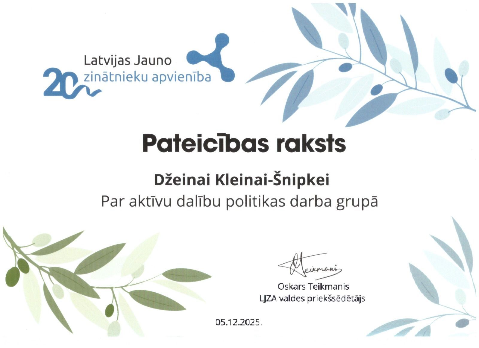 Doktorantes saņem patiecību par aktīvu iesaistīšanos Latvijas Jauno zinātnieku apvienībā