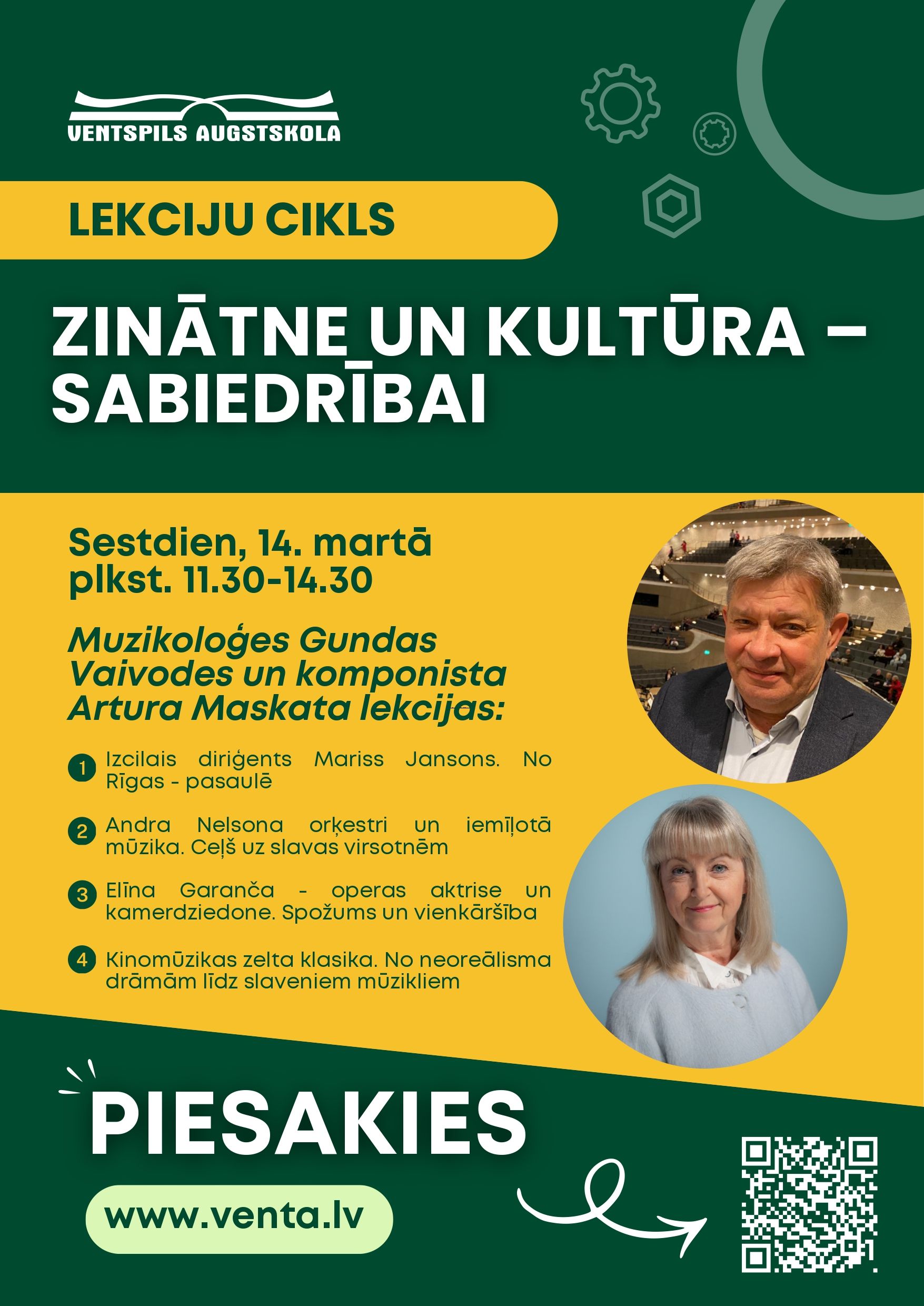 Ventspils Augstskolas (VeA) Mūžizglītības centra ikmēneša lekciju cikls “Zinātne un kultūra – sabiedrībai” kļuvis par vietu, kur interesenti var satikt Latvijā pazīstamus zinātniekus un kultūras personības. 14. martā kopā ar muzikoloģi Gundu Vaivodi un komponistu Arturu Maskatu klausītājiem būs iespēja iedziļināties izcilu mūziķu profesionālajā ceļā un radošajā darbībā, kas vedusi uz starptautisku atzinību, kā arī gūt ieskatu kinomūzikas zelta klasikā.