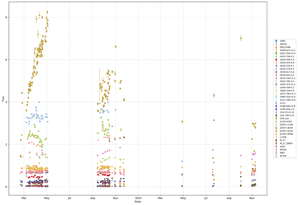 - māzeru uzliesmojumu, kas atbilst epizodiskas akrēcijas scenārijiem, identificēšana, tostarp straujas izmaiņas vairākās māzera spektrālās līnijas komponentēs;