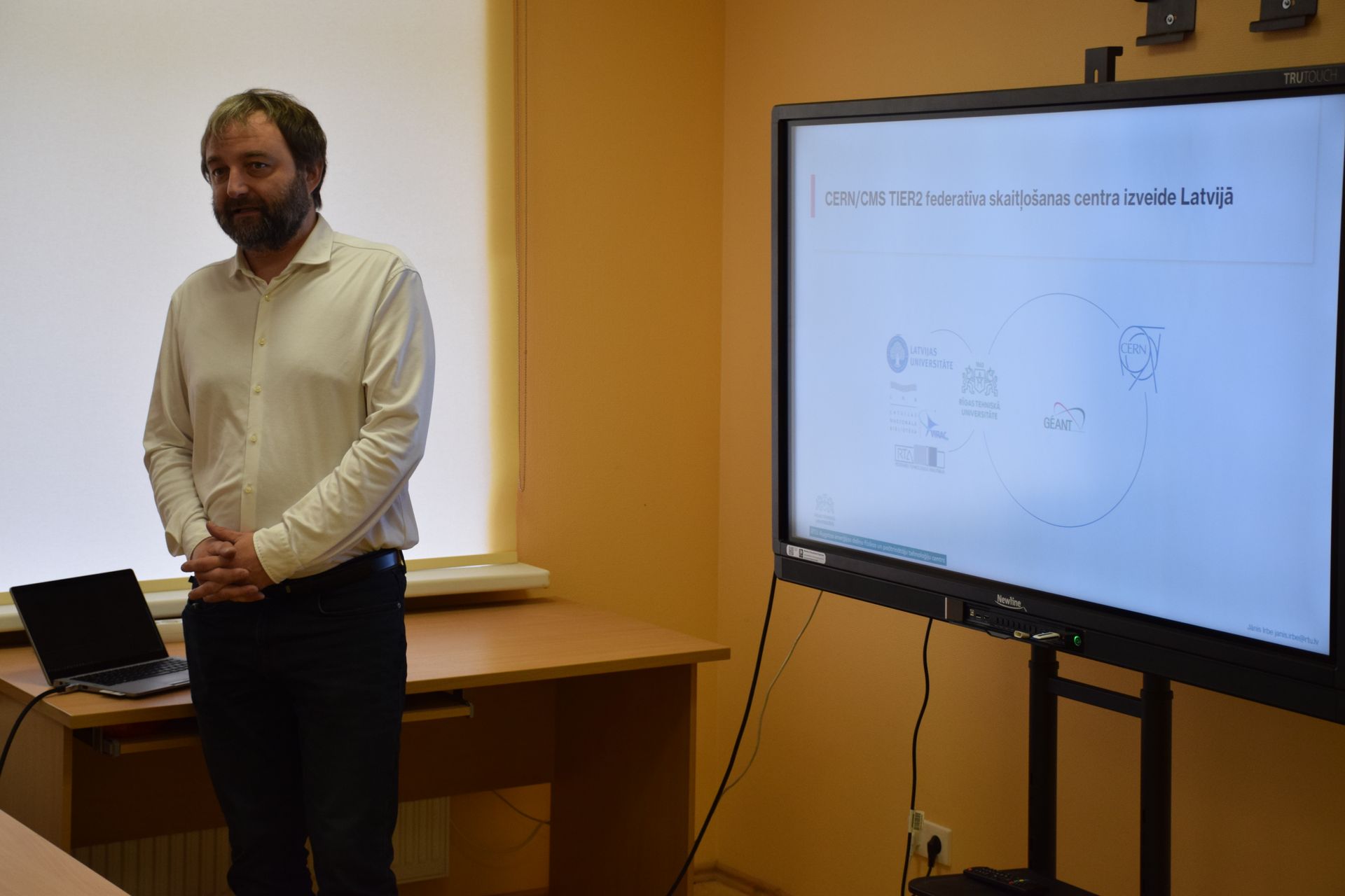 Darba semināru atklāja RTU pārstāvis Jānis Irbe, kurš sniedza darba semināra dalībniekiem aktuālo informāciju par CERN TIER II federatīva skaitļošanas centra izveidi Latvijā, iepazīstināja klātesošos ar CERN CMS – Compact Muon Solenoid detektora eksperimentu, lielo Hadrona paātrinātāju (LHC), kā arī ar Latvijas un Baltijas partneru vizīti uz Ženēvu. Papildus iepriekš minētajai informācijai, Jānis Irbe JIV-ERIC nacionālā konsorcija darba semināra dalībniekiem ziņoja par 2023-2024.gada CERN CMS TIER II aktivitātēm. Kā svarīgu faktu savā ziņojumā Jānis Irbe atzīmēja nākotnes vīziju - CERN/CMS TIER2 federatīva skaitļošanas centra izveidi Baltijā.