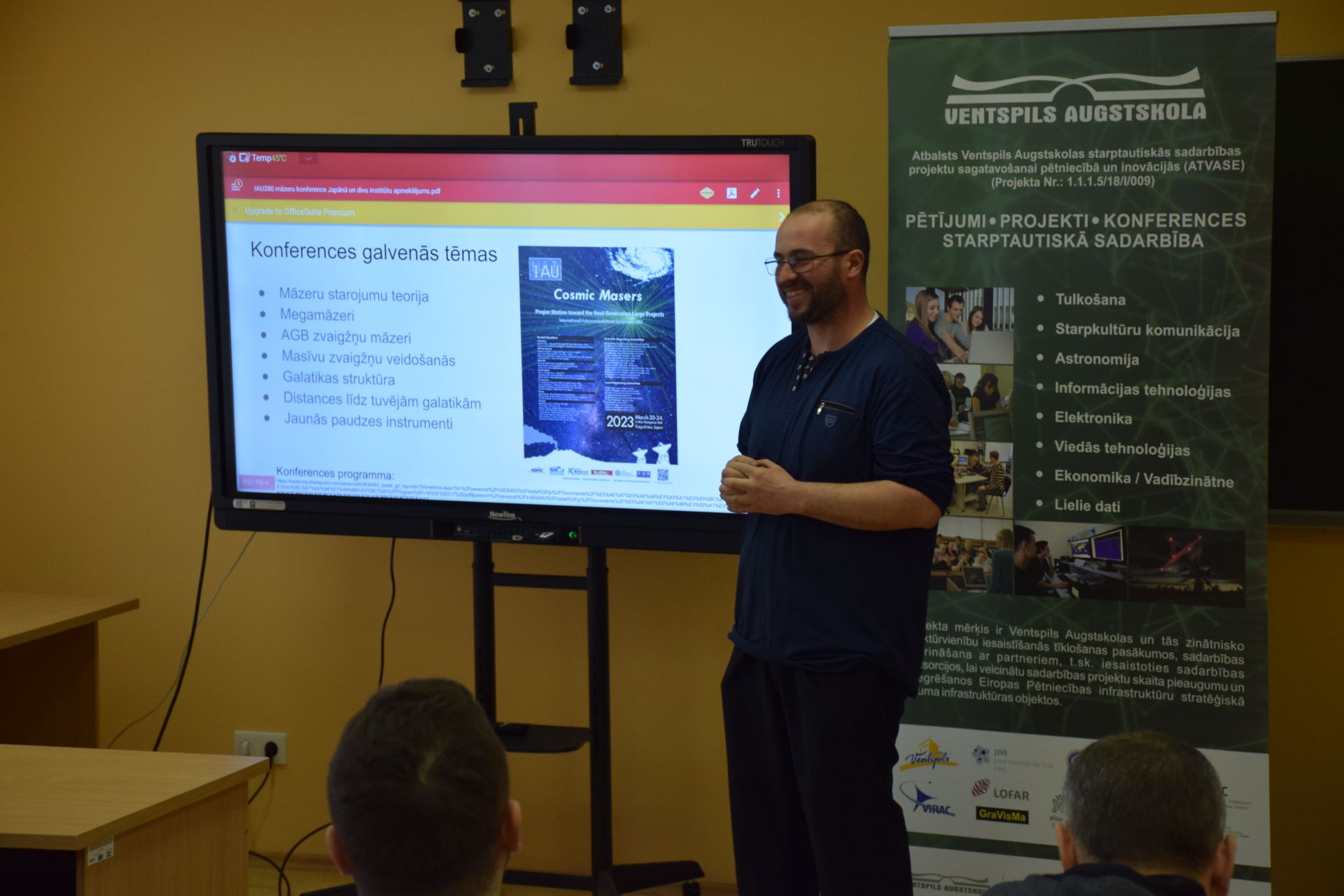 Darba semināru noslēdza VeA IZI VSRC Astronomijas un astrofizikas nodaļas vadošais pētnieks Ivars Šmelds un pētnieks Artis Aberfelds ar ziņojumu par IAUS380 māzeru konferenci Japānā, kurā abi pētnieki piedalījās ar diviem postera ziņojumiem laika periodā no 2023. gada 20. līdz 24. martam un divu institūtu apmeklējumu. Savā ziņojumā pētnieki iepazīstināja klātesošos ar IAUS380 māzeru konferences tēmām, konferences ietvaros būtiskākiem ziņotiem rezultātiem – astrometriju, vēlo evolūciju stadiju zvaigžņu māzeriem, māzeru teoriju, zvaigžņu veidošanās un nākotnes instrumentiem. Turpinājumā Astronomijas un astrofizikas nodaļas vadošais pētnieks Ivars Šmelds un pētnieks Artis Aberfelds informēja klātesošos par tīklošanās pasākumu, National Astronomical Observatory of Japan (NAOJ) un Ibaraki observatorijas apmeklējumu rezultātiem.