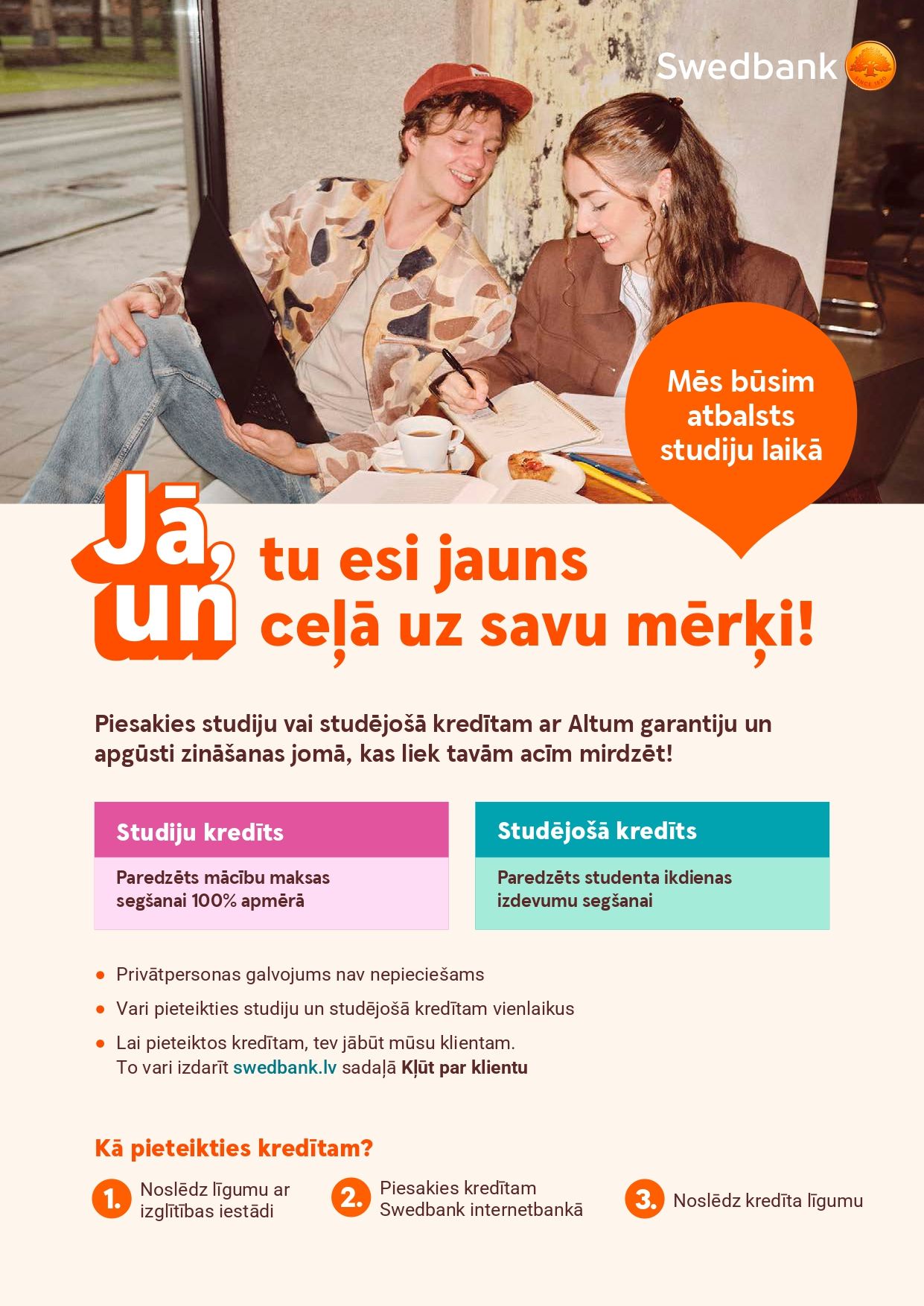 Studiju kredīts ir paredzēts studiju maksas segšanai, studējošā kredīts – studenta ikdienas izmaksu segšanai. Visu aktuālo informāciju par Swedbank studiju un