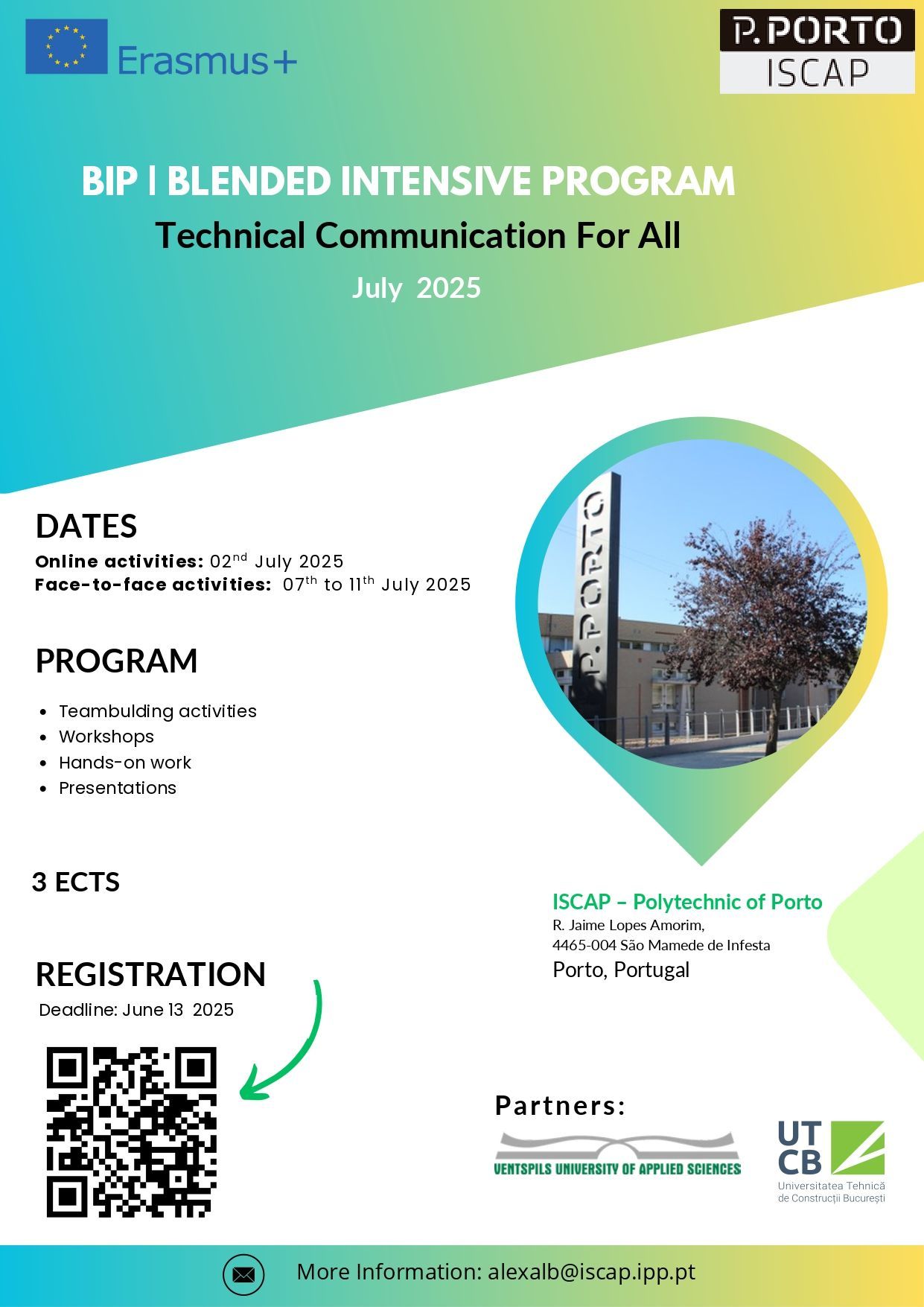 Erasmus+ projekta ietvaros Portugāles Politehniskais institūts sadarbībā ar Ventspils Augstskolu un Bukarestes Tehnisko Universitāti organizē Kombinēto intensīvo programmu (BIP) "Technical Communication For All".