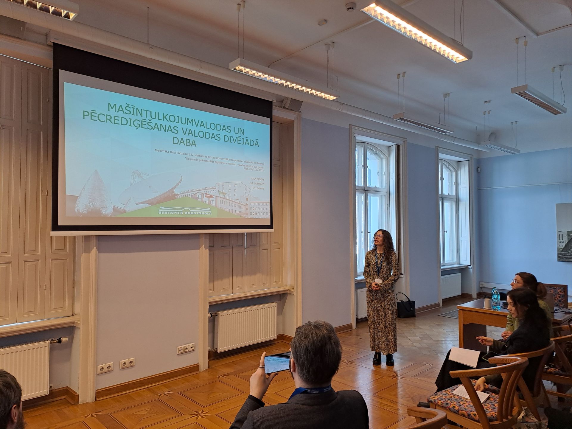 Aiga Bādere, kuras promocijas darba izstrāde pakāpeniski tuvojas noslēguma posmam, uzstājās ar referātu “Mašīntulkojumvalodas un pēcrediģēšanas valodas divējādā daba”.
