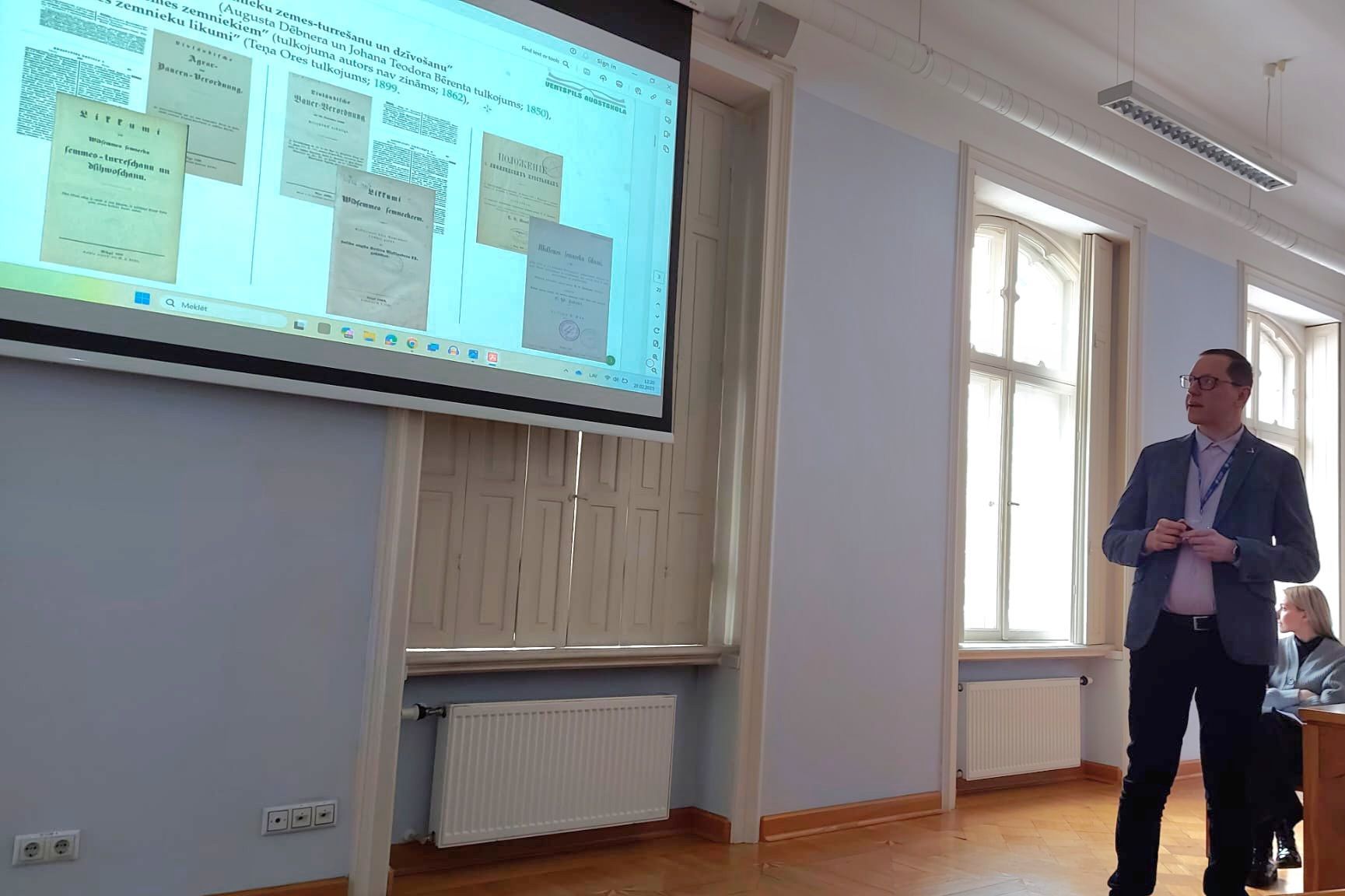 Asociētais profesors Jānis Veckrācis iepazīstināja ar pētījumu “Juridiskās speciālās leksikas iezīmes 1850.–1899. gada Vidzemes zemnieku likumu tulkojumos latviešu valodā”.