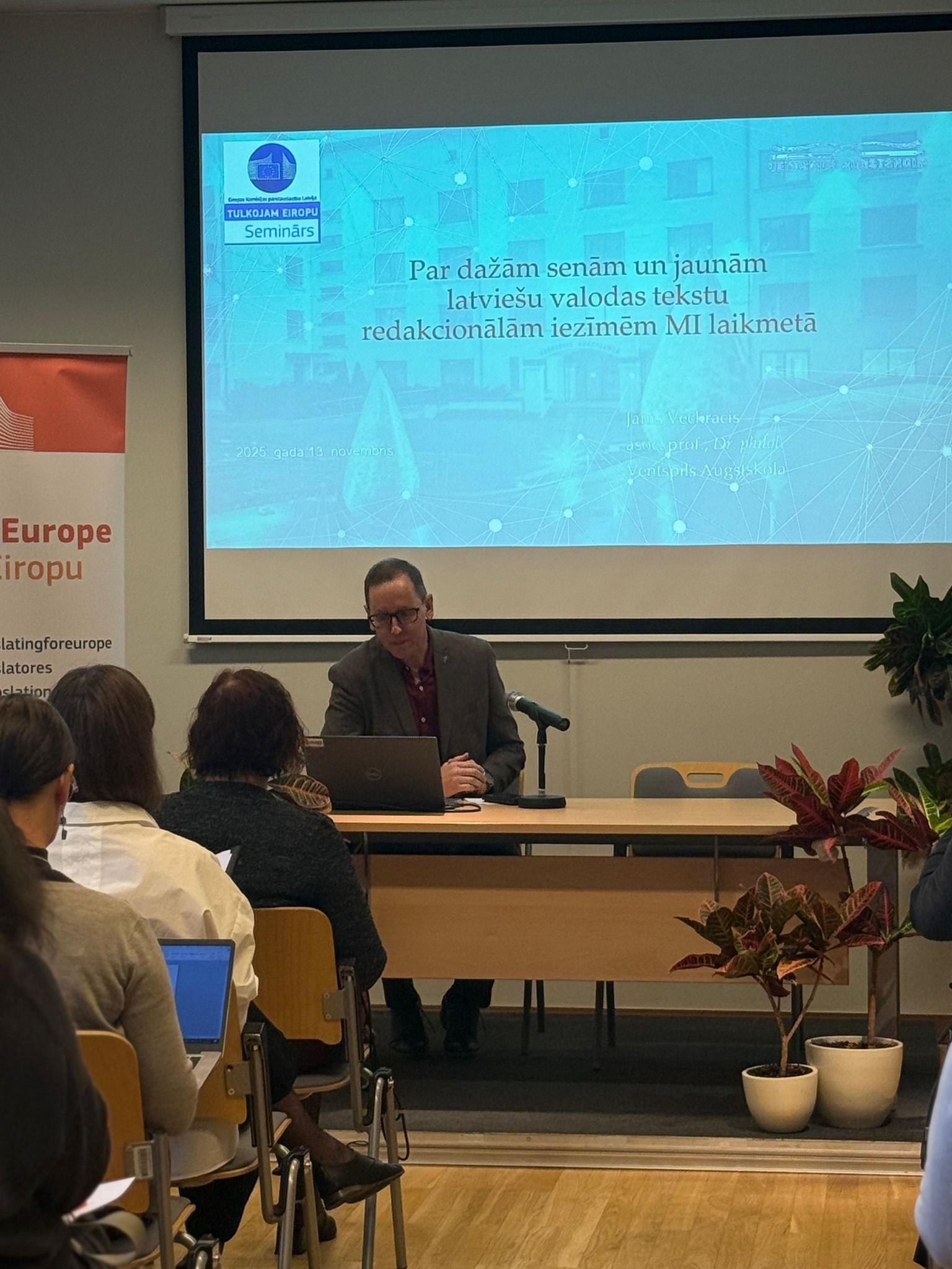 Ventspils Augstskolas Tulkošanas studiju fakultātes dekāns Jānis Veckrācis 13. novembrī Eiropas mājā Rīgā piedalījās seminārā “Tulkojam Eiropu. Tulkotāja mainīgais profils mākslīgā intelekta laikmetā”. Seminārs ik gadu pulcina nozares profesionāļus un augstskolu pasniedzējus un ir daļa no pasākumu cikla, ko organizē Eiropas Komisijas pārstāvniecība Latvijā.