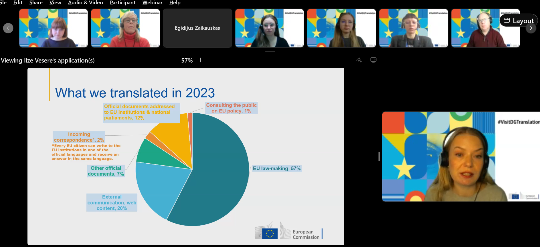 Eiropas Komisija 22. novembrī organizēja virtuālo vizīti Tulkošanas ģenerāldirektorātā, kurā piedalījās arī Ventspils Augstskolas Tulkošanas studiju fakultātes maģistra programmas “Lietišķo tekstu tulkošana” studenti. Pasākums bija ļoti plaši apmeklēts (aptuveni 800 dalībnieku), un mūsu tulkošanas programmas studentiem bija iespēja uzzināt visu par tulku un tulkotāju darbu Tulkošanas ģenerāldirektorātā un citās ES iestādēs. Pasākuma organizētāji sniedza ieskatu ES iestādēs pārtulkoto dokumentu apjomā un pastāstīja, kādus datorizētās un mašīntulkošanas, kā arī mākslīgā intelekta rīkus izmanto ES iestāžu tulkotāji.
