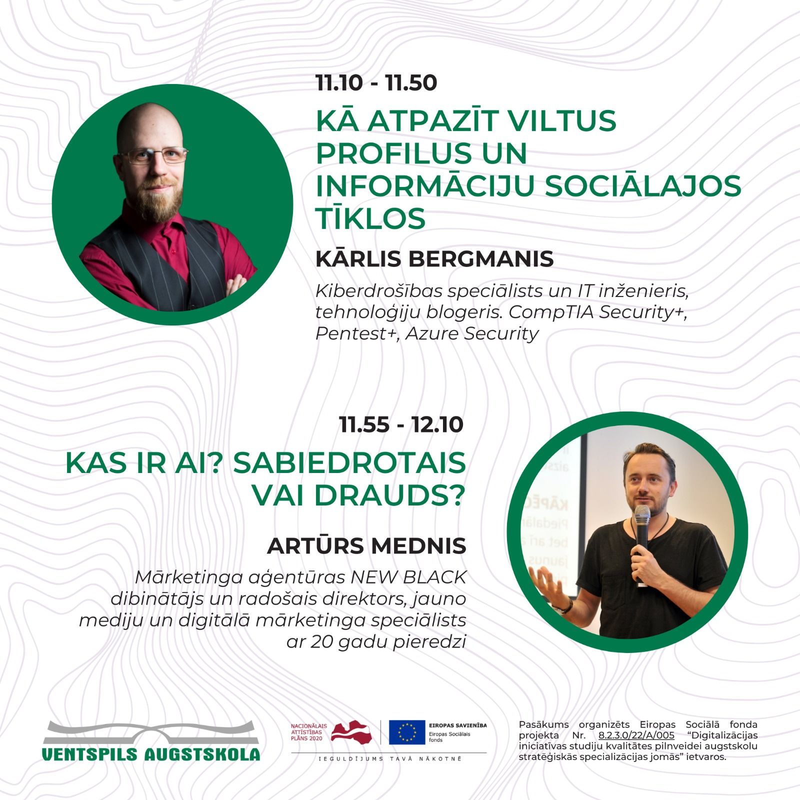 - Plkst. 11.10 – 11.50 uzstāsies kiberdrošības speciālists, IT inženieris un tehnoloģiju blogeris Kārlis Bergmanis ar vieslekciju “Kā atpazīt viltus profilus un informāciju sociālajos tīklos”.