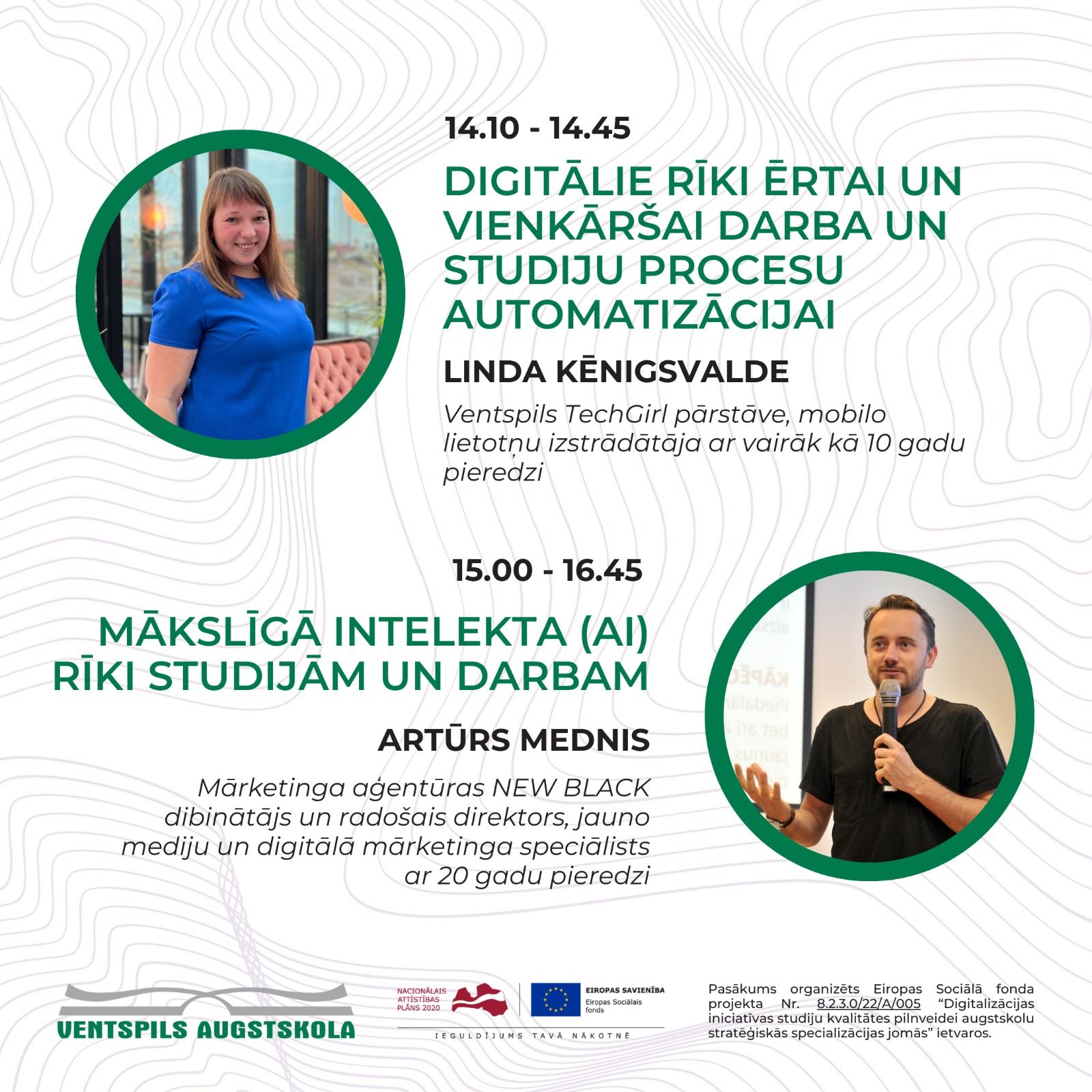 - Plkst. 14.10 – 14.45 notiks lekcija “Digitālie rīki ērtai un vienkāršai darba un studiju procesu automatizācijai”. Lekciju sniegs Linda Kēnigsvalde, kura ir Ventspils TechGirl pārstāve, mobilo lietotņu izstrādātāja ar vairāk kā 10 gadu pieredzi.