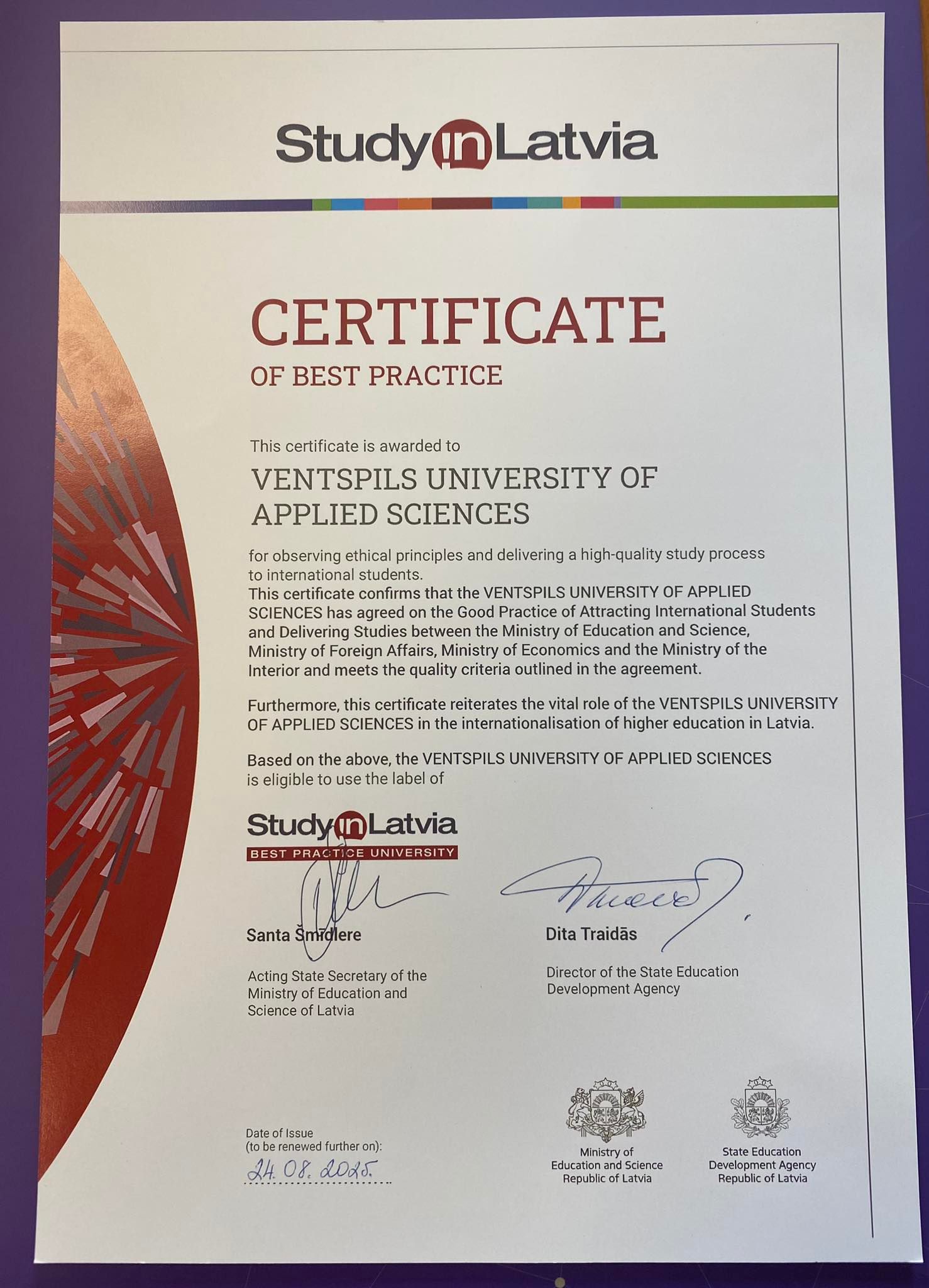 Šī gada 28. jūlijā Ventspils Augstskola saņēma sertifikātu “Labas prakses augstskola”, ko pasniedza Study in Latvia vadītāja Sintija Šmite-Tilika. Sertifikāts apliecina labas prakses ievērošanu ārvalstu studējošo piesaistē un studiju nodrošināšanā.