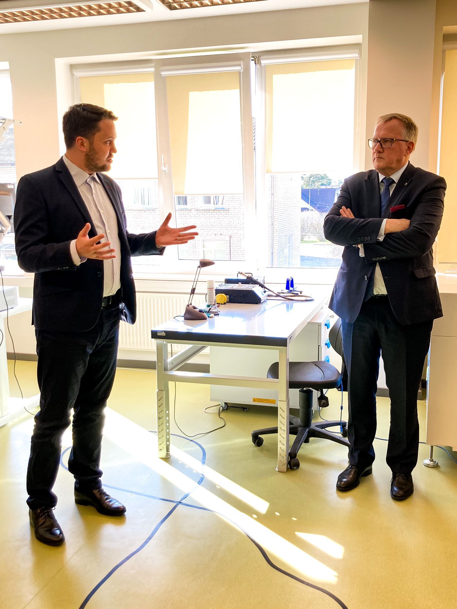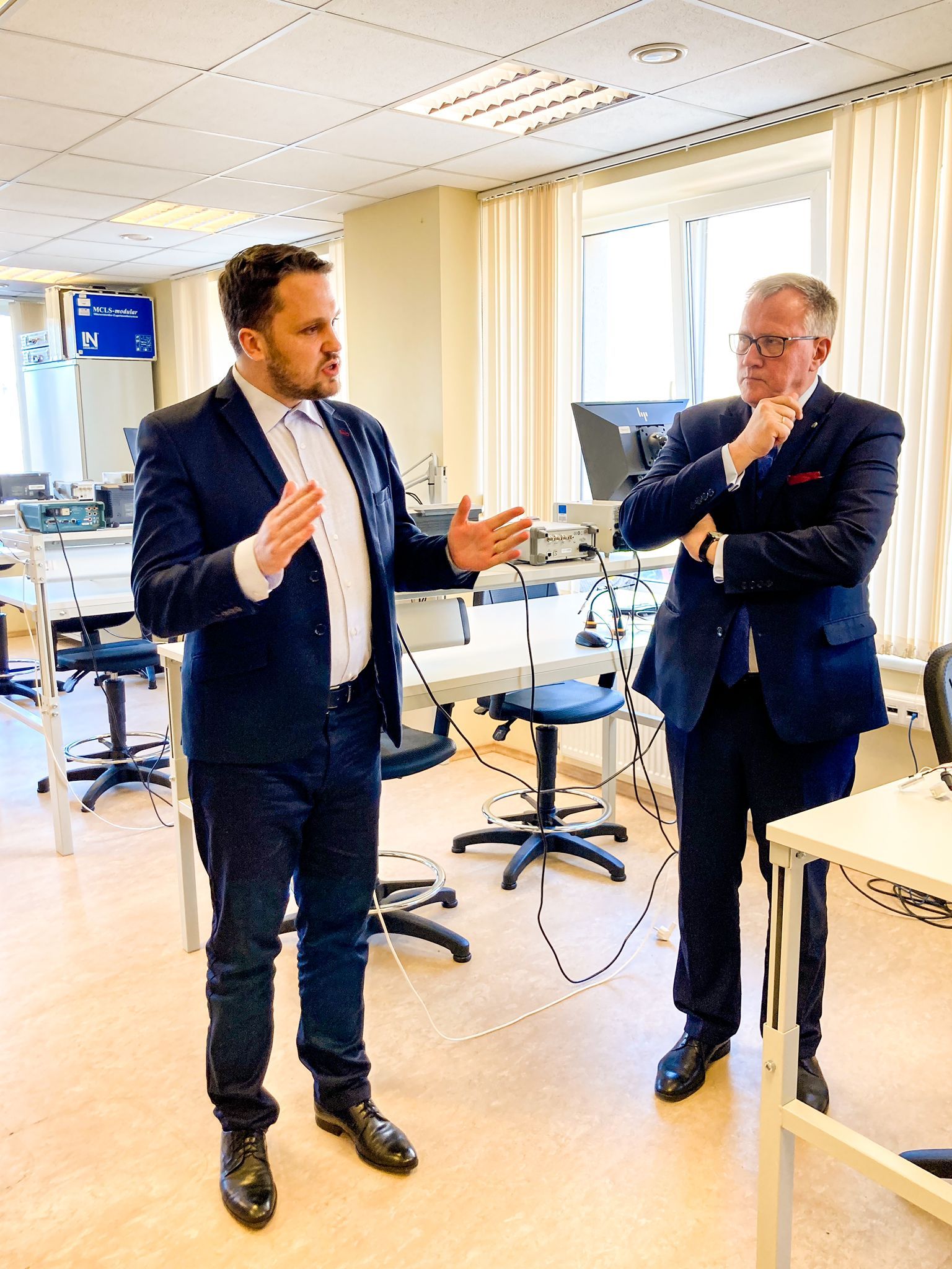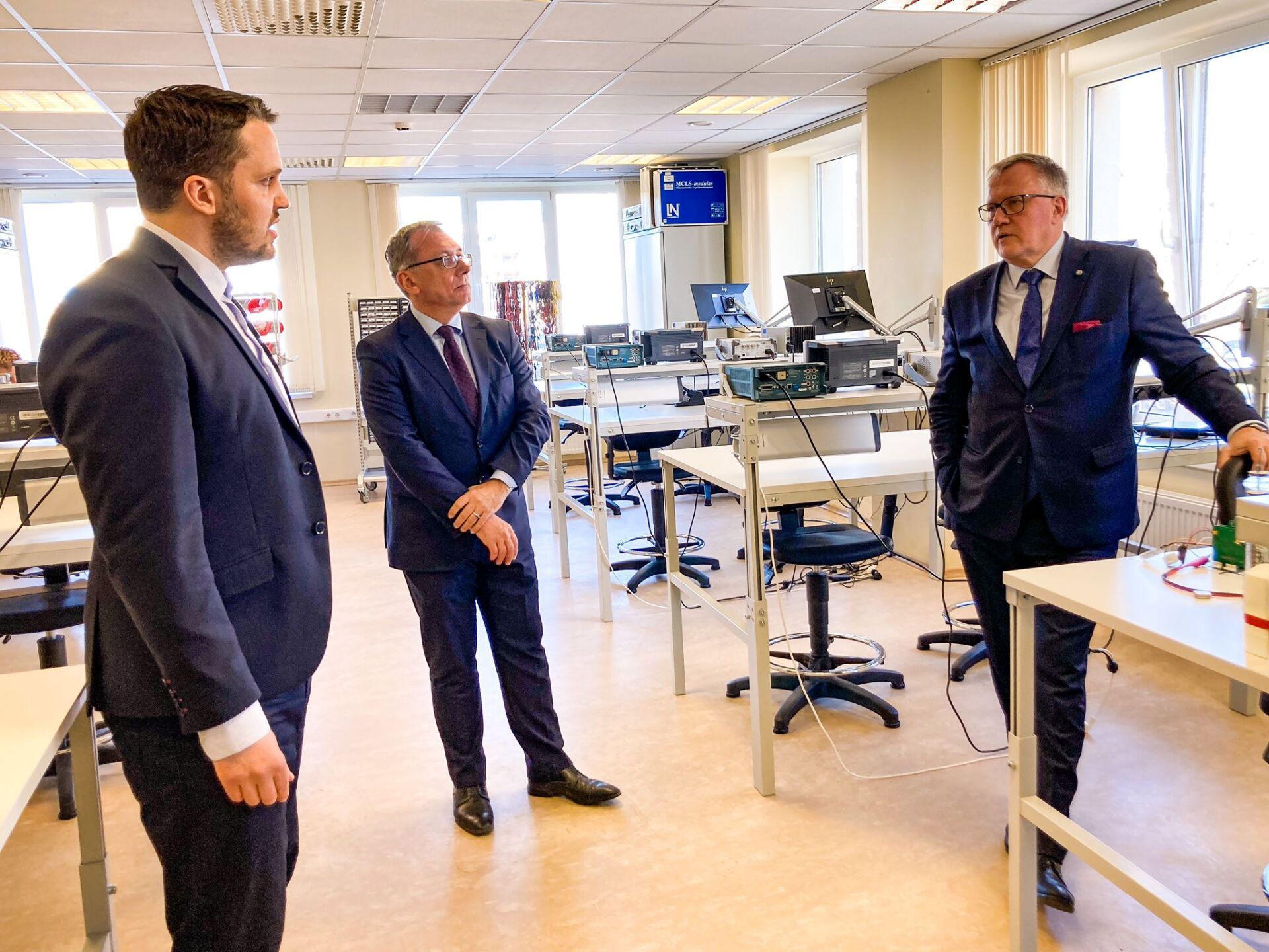 Tikšanās sākās ar ekskursiju pa augstskolas renovētajām telpām – laboratorijām, video studiju, auditorijām. Priekšsēdētājs augstu novērtēja, ka VeA telpās jau pirms COVID-19 pandēmijas sākuma tika izveidota mākoņdatošanas klase, kas ļāva VeA veiksmīgi pielāgoties neklātienes studiju režīmam. Augstskolas pārstāvji iepazīstināja priekšsēdētāju ar diennakts laboratoriju, kurā jaunieši jebkurā laikā var nākt un strādāt pie saviem projektiem, kā arī informēja, ka VeA telpās notiek skolēniem paredzēts STEM klubs. Tā ietvaros jauniešiem ir iespēja nākt un ar laborantu atbalstu īsteno savu elektronikas inženierijas ideju. Svarīgi bija arī uzsvērt, ka VeA nodrošina telpas arī Ventspils skolēniem un skolotājiem, kuri vēlās īstenot savas idejas un kuriem nepieciešams profesionāli aprīkotas telpas.