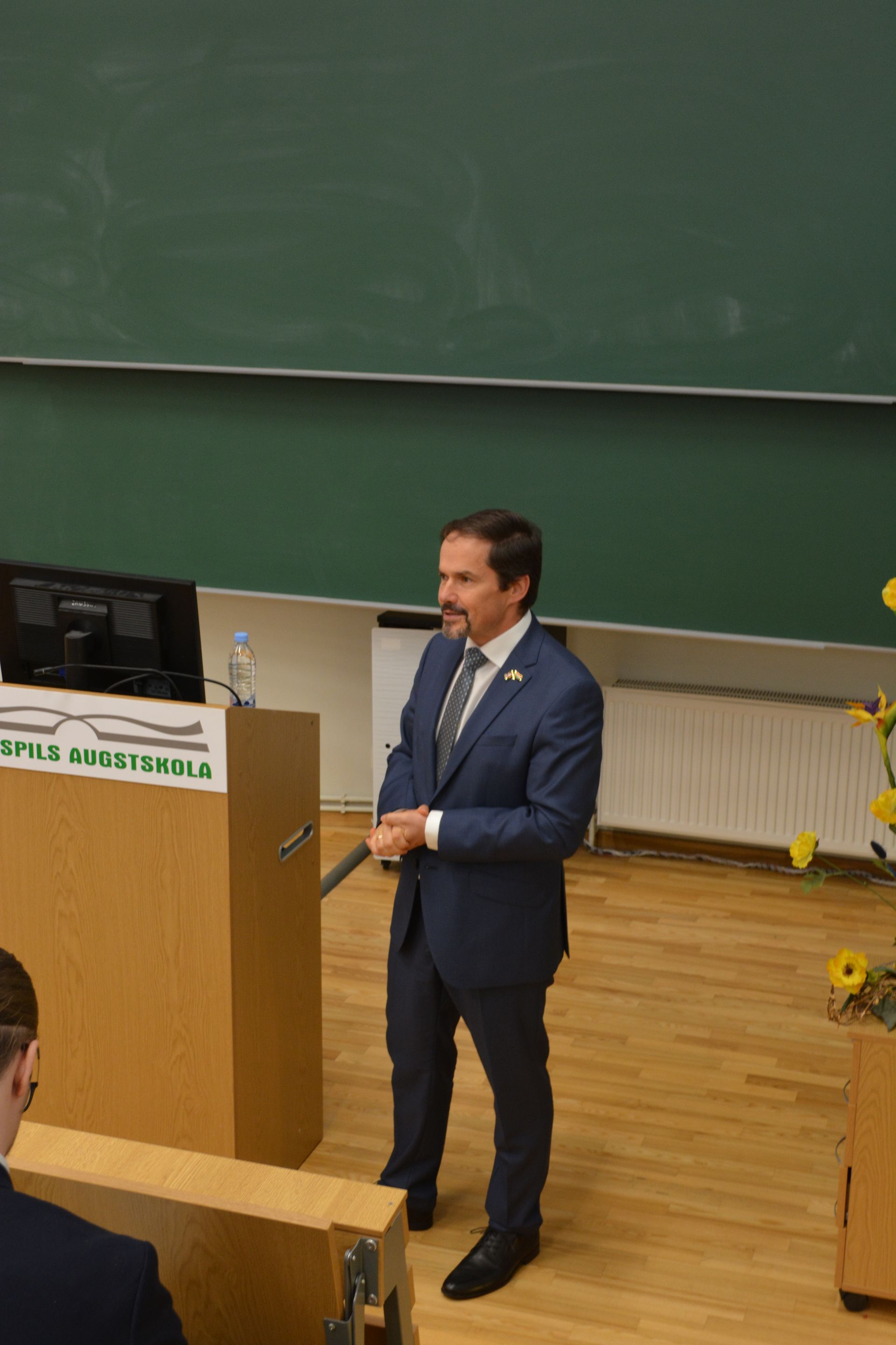 Noslēgumā vēstnieka kungs izteicās atzinīgi par mūsu studentu zinošajiem jautājumiem un aizraujošajām diskusijām, kas izveidojās vieslekcijas laikā.