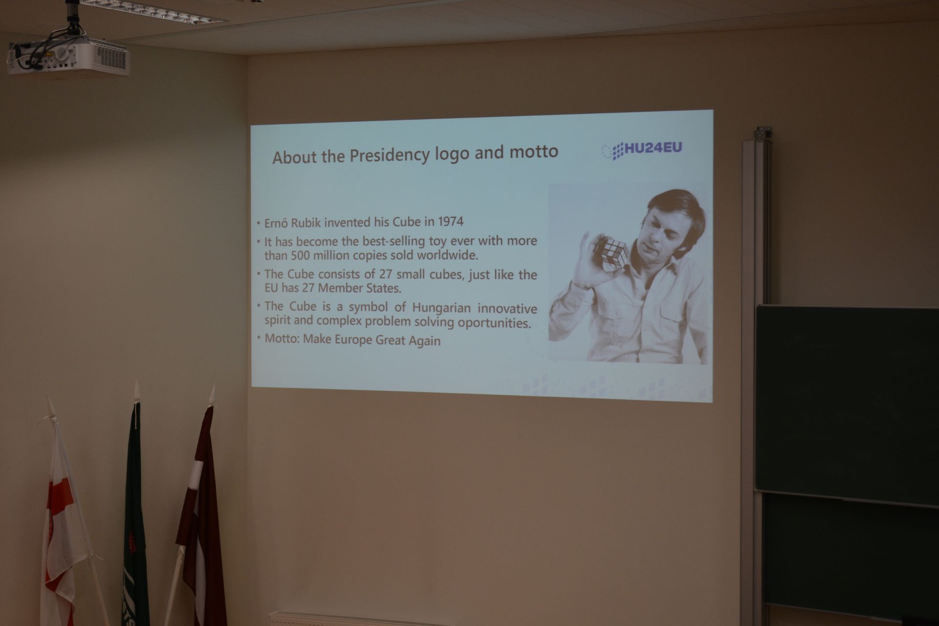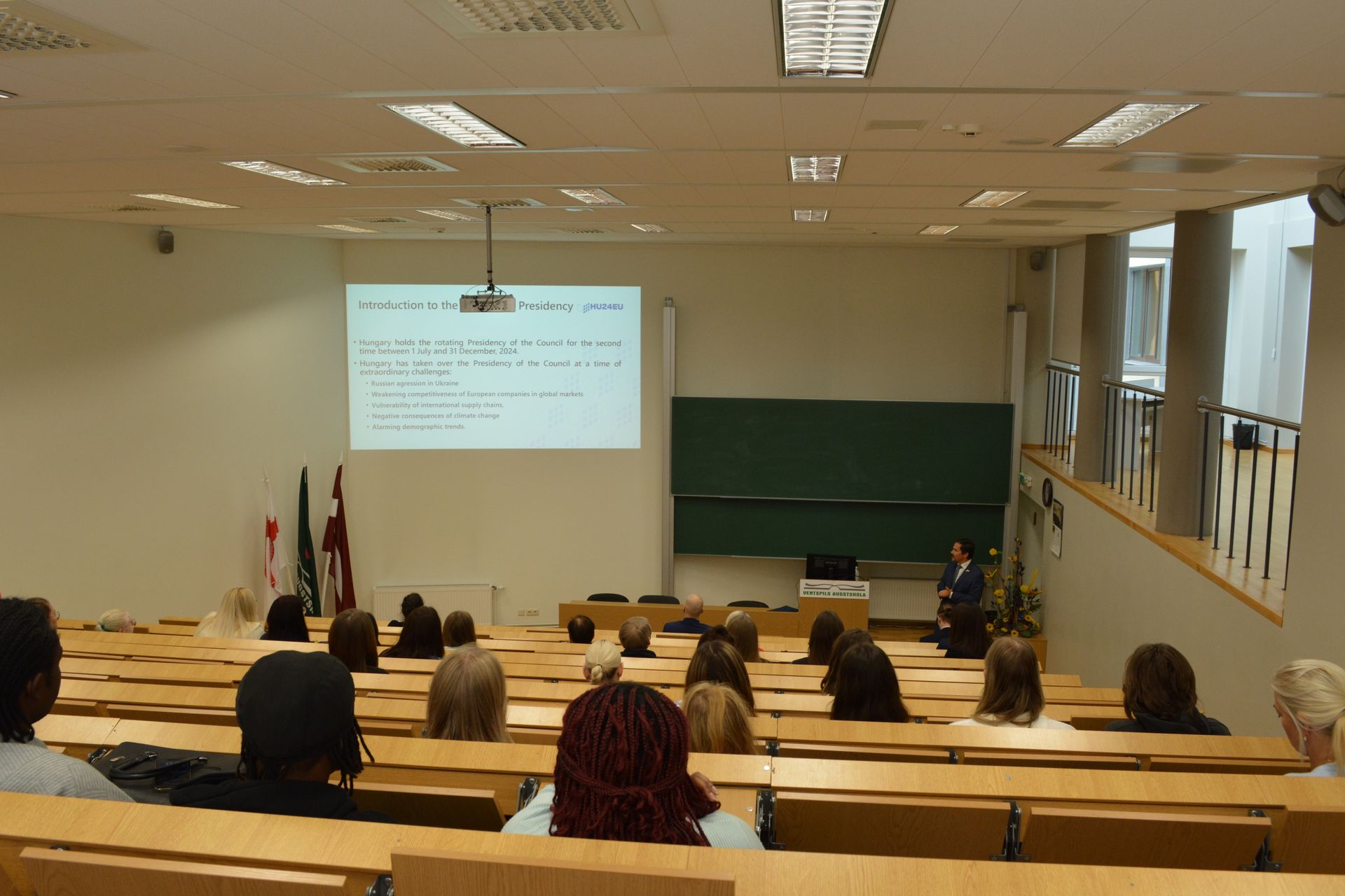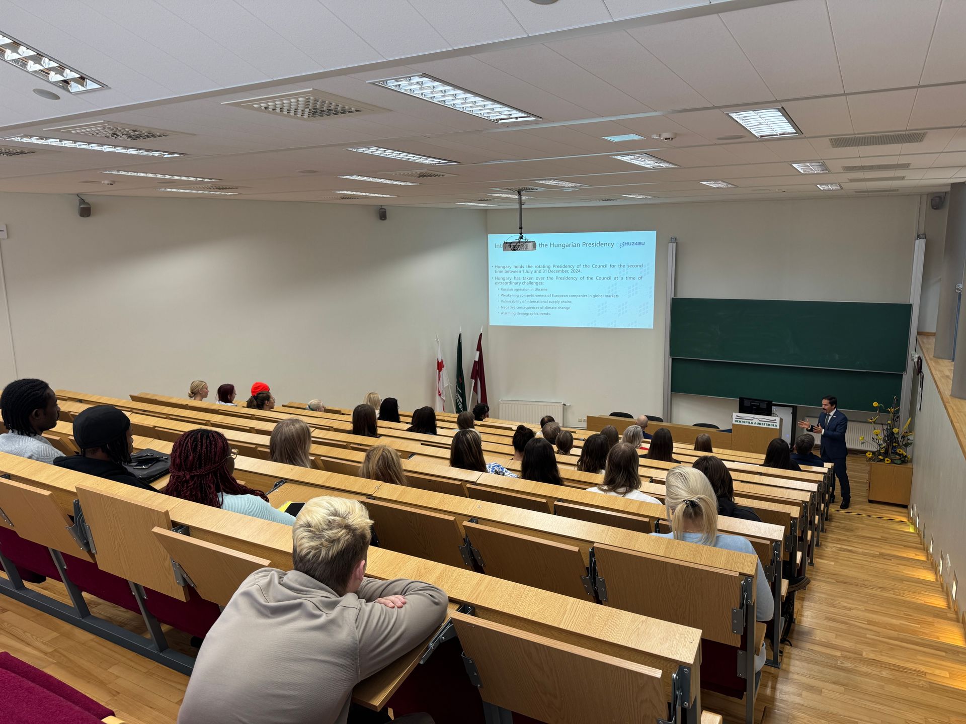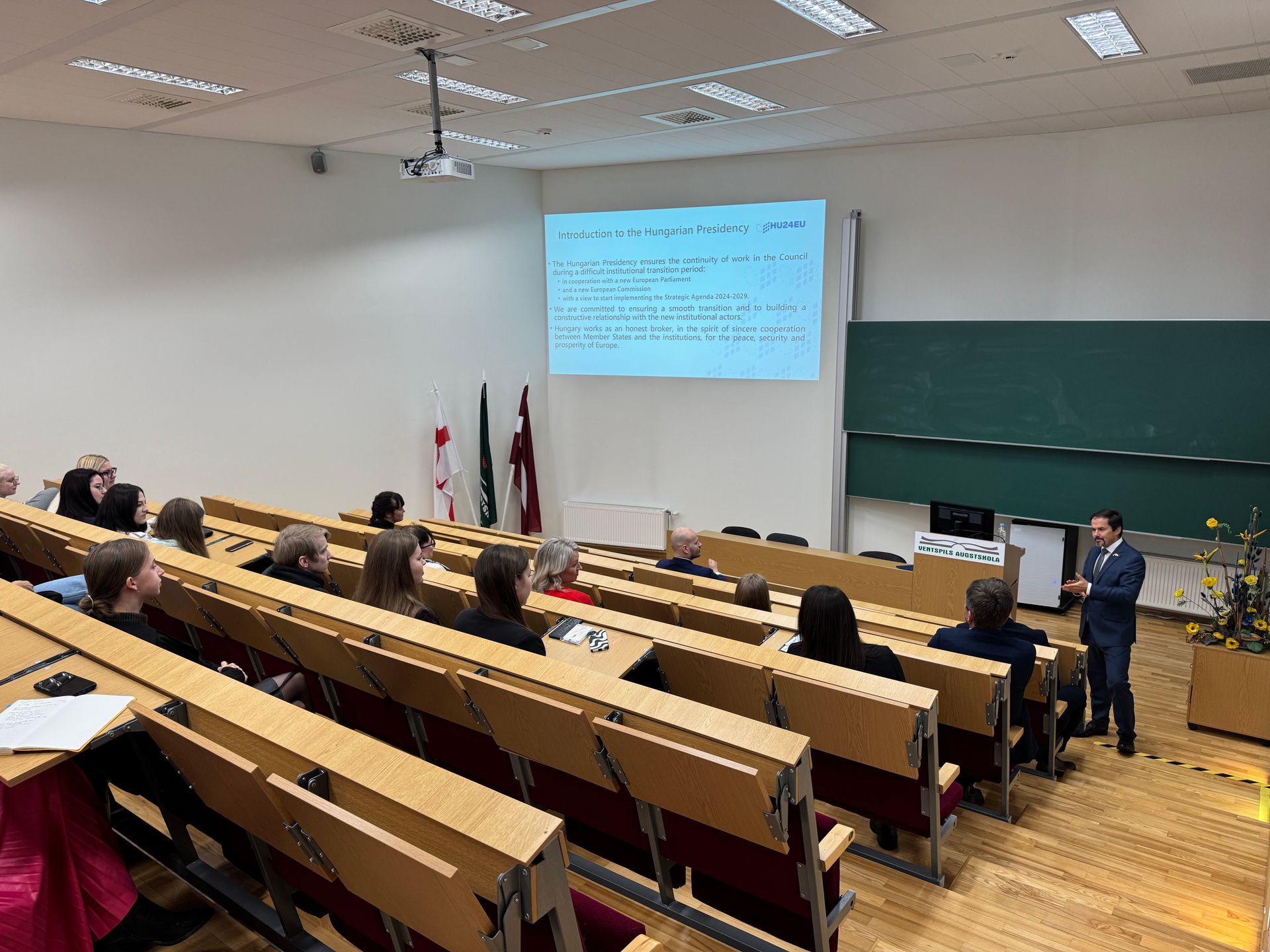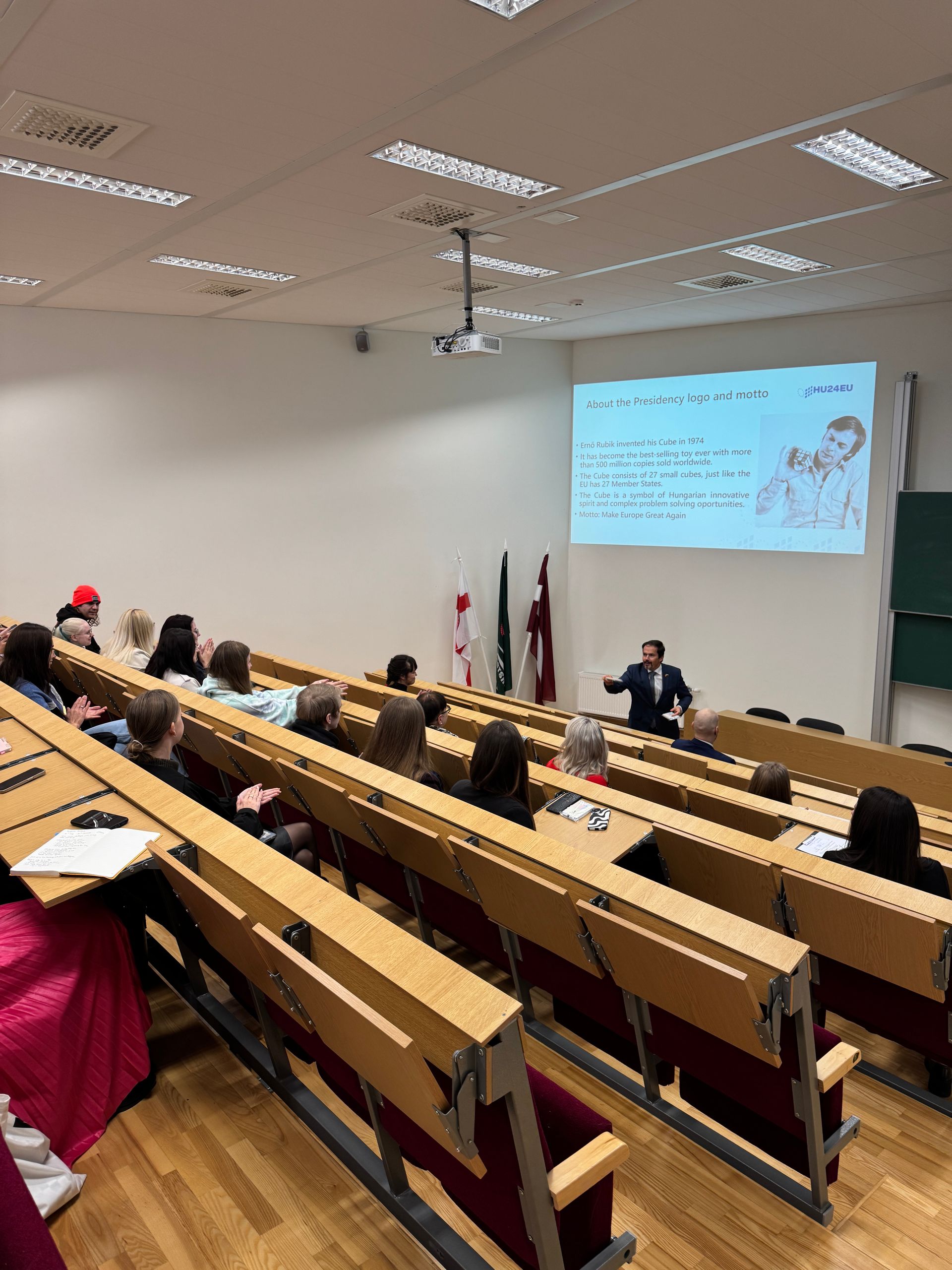 Vizītes laikā vēstnieka kungs tikās ar bakalaura un maģistra studiju programmu studentiem un pasniedzējiem, diskutējot ne tikai par Ungārijas prezidentūru Eiropas Savienības Padomē, bet arī par citiem studentus interesējošiem jautājumiem, kas saisīti ar Eiropu, politiku, diplomātiju un Eiropas Savienību.