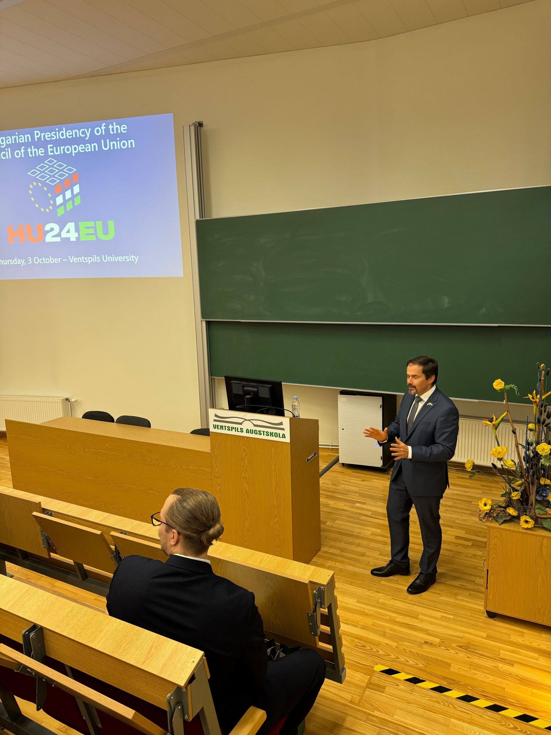 Aizvadītajā nedēļā Ventspils Augstskolas studenti un personāls reģionālās vizītes ietvaros augstskolā sagaidīja ārkārtējo un pilnvaroto Ungārijas vēstnieku Latvijā V.E. Ğerğu Urkuti (György Urkuti), kopā ar vēstniecības atašeju ārējās ekonomikas jautājumos Pēteru Šoltēsu (Péter Soltész). Vēstnieka kungs sveica studentus ar aizraujošu vieslekciju par Ungārijas prezidentūru Eiropas Savienības Padomē, kas norisinās no 2024. gada 1. jūlija līdz 31. decembrim.