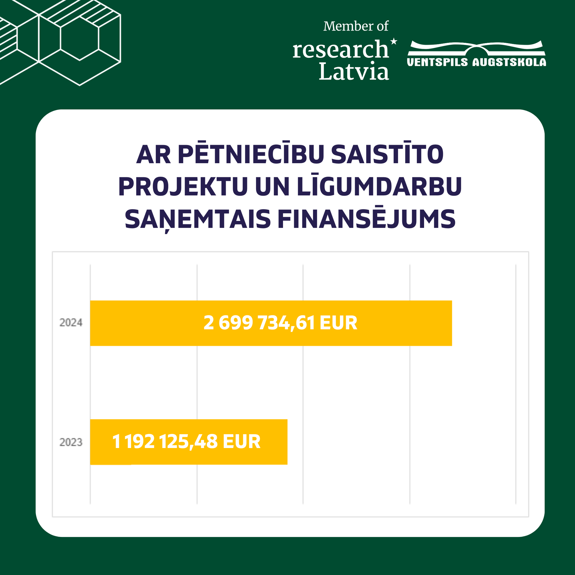 2024. gadā kopējais saņemtais finansējums, kas saistīts ar pētniecības projektiem sasniedza nepilnus 2,7 miljonus eiro. Tas ir būtisks pieaugums par nepilniem 1,5 milj. eiro, salīdzinot ar 2023. gadu. Būtiskākais finansējuma pieaugums 2024. gadā novērojams līgumdarbu un intelektuālā īpašuma pārneses jomā, kas apliecina augstskolas spēju radīt praktiski pielietojamus risinājumus industrijas vajadzībām.