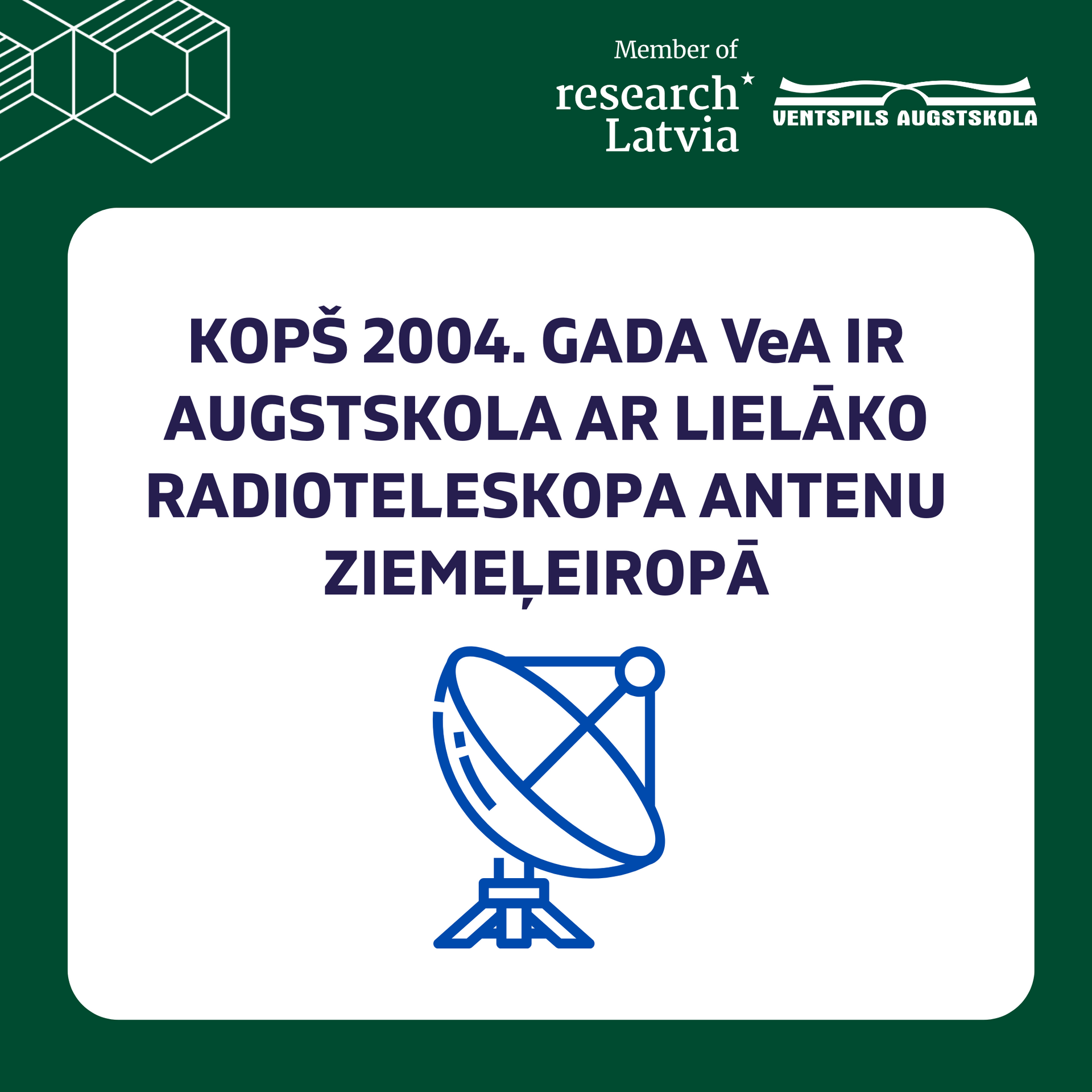 Lai arī Ventspils Augstskolai šogad apritēs tikai 28 gadi, lielāko tās pastāvēšanas laiku tās paspārnē ir pasaules līmeņa pētniecības centrs – Ventspils Starptautiskais radioastronomijas centrs (VSRC). Ventspils Augstskola jau 21 gadu ir augstskola ar lielāko radioteleskopa antenu Ziemeļeiropā!