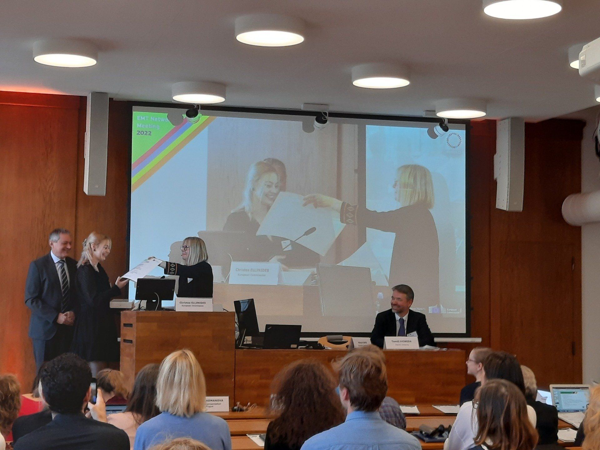 Jauno tulkotāju šajā pasākumā uzaicināja piedalīties Eiropas Komisijas (EK) Tulkošanas ģenerāldirektorāta pārstāvji, jo viņa šā gada pavasarī kopā ar sava kursa studiju kolēģēm piedalījās maģistrantūras līmeņa tulkošanas studiju programmu konkursā "2022 eMT challenge". Konkursā bija jāanalizē mašīntulkota teksta kvalitāte un tajā sacentās 112 dalībnieki. Sonora ieguva 1. vietu tulkojuma izvērtēšanā angļu-latviešu valodu pārī, kā arī ierindojās trīs vislabāko dalībnieku vidū visu dalībnieku konkurencē. EMT (European Master’s in Translation) tīkla pārstāvju sanāksmē Prāgā svinīgā ceremonijā Eiropas Komisijas Tulkošanas ģenerāldirektorāta ģenerāldirektors Kristoss Elinidess (Christos Ellinides) Sonorai pasniedza diplomu un balvu - planšetdatoru. Pateicoties uzvarai šajā konkursā, jau šā gada novembra sākumā (9.-11.11.) Sonora ir uzaicināta piedalīties vēl vienā pasākumā – EK konferencē “Tulkojam Eiropu”, kas norisināsies Briselē un noteikti būs vērtīgs pasākums maģistrantūras studiju noslēguma posmā, jo pašreiz Sonora raksta maģistra darbu. Sirsnīgi sveicam Sonoru Bogdanovu ar panākumiem!