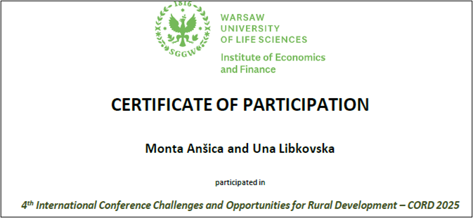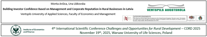 2025. gada 19. novembrī Ventspils Augstskolas profesore Una Libkovska un doktorante Monta Anšica Valsts pētījumu programmas projekta “Pierādījumos balstītu risinājumu izstrāde pieaugušo efektīvai profesionālās kompetences pilnveidei un tās rezultātu pārneses uz praksi novērtēšanai Latvijā” (VPP-IZM-Izglītība-2023/4-0001) ietvaros piedalījās Varšavas Dabaszinātņu Universitātes (WULS-SGGW) Ekonomikas un finanšu institūta organizētajā 4. starptautiskajā zinātniskajā konferencē “Challenges and Opportunities for Rural Development (CORD 2025)”, prezentējot stenda referātu “Building Investor Confidence Based on Management and Corporate Reputation in Rural Businesses in Latvia”.